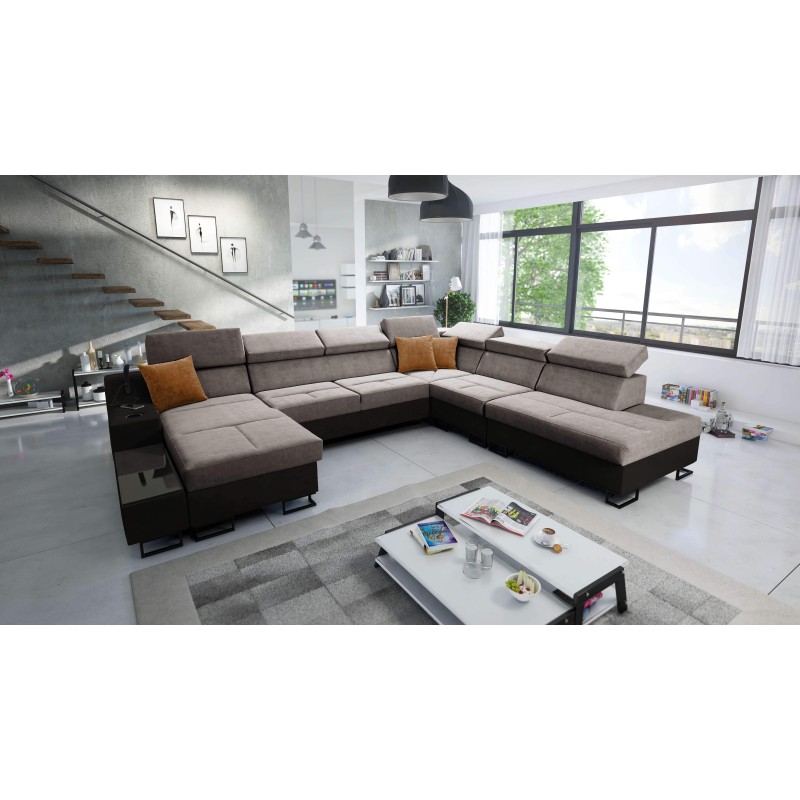 Відкрийте для себе розкіш і комфорт, які пропонує Кутовий диван у формі U Avanti X з функцією сну та лампою з портом USB – оброблений елегантною, міцною тканиною вельвет, Whisper 5 + чорна екошкіра. Цей сучасний, а водночас функціональний меблевий виріб створено для тих, хто цінує не лише стиль, але й практичність. Спроектований з увагою до найдрібніших деталей, завдяки чому створює унікальне поєднання естетики та комфорту.